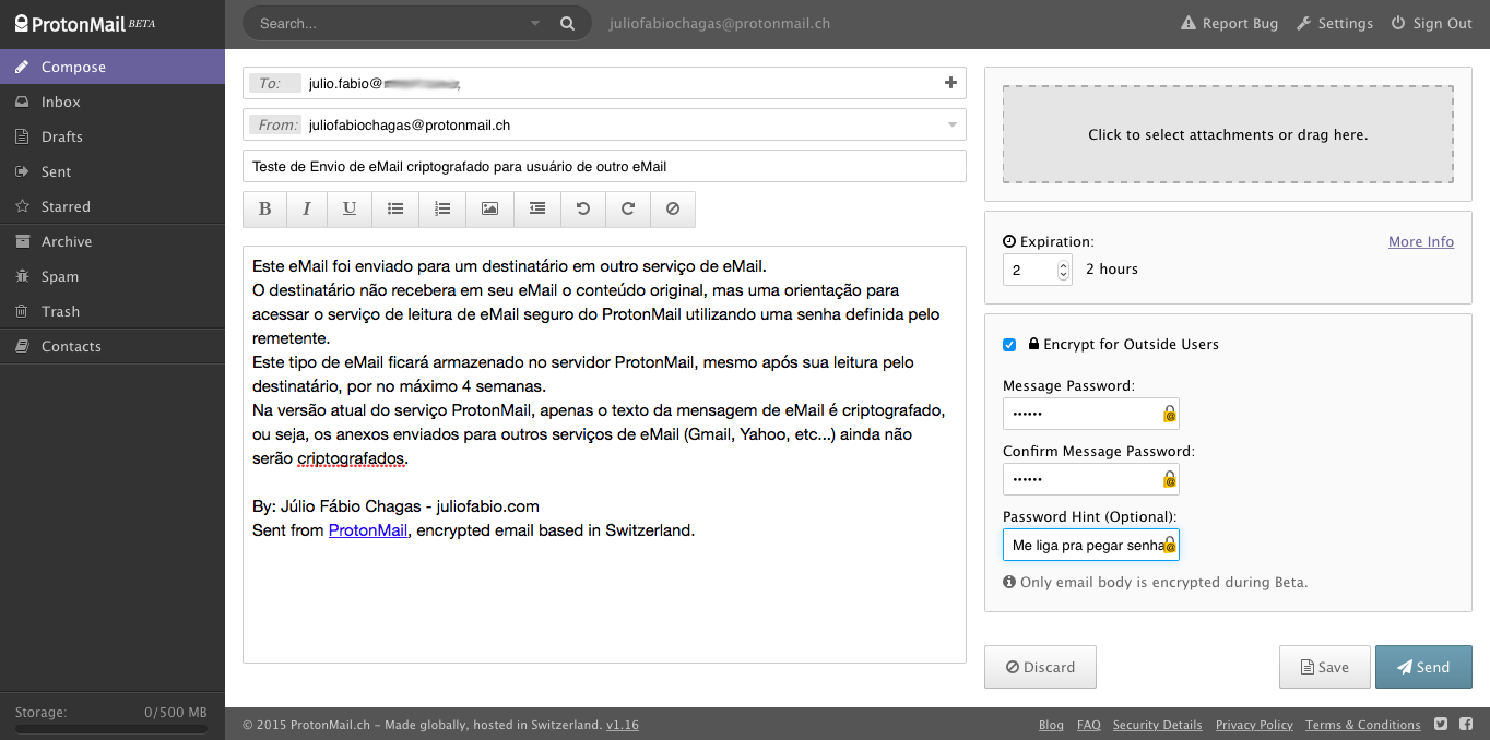 O legal é que você pode enviar eMails seguros para pessoas que não usam o serviço, mas elas receberão apenas um aviso de que terão que acessar um link e informar uma senha que o remetente definiu para poder ler o conteúdo. O destinatário poderá responder o eMail direto do ProtonMail garantido o retorno também de forma segura. Mas também é possível enviar eMail para alguém do Gmail ou qualquer outro serviço sem criptografar e será enviado como um eMail qualquer. Este tipo de eMail não é apagado automaticamente do serviço.