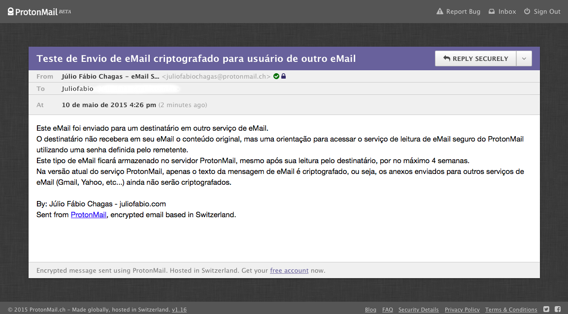 Caminhamos bem, chegamos na fase de testes internos e tudo corria bem, inclusive com servidores em nuvem já preparados para milhões de usuários. Mas, em outubro de 2014, durante evento do TEDGlobal, foi apresentado o ProtonMail, justo quando corríamos para lançar nosso produto em Dezembro daquele ano. (clique neste link para ver o vídeo com a apresentação, mas também coloquei o vídeo no inicio deste posto).